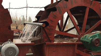 輪斗洗砂機在水力作用下將山砂中的石粉清洗掉,如上所示